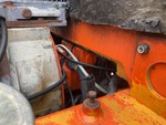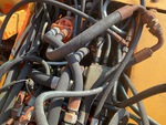 The hydraulic system was operational. Boom ram and bucket ram seals leaking. Hydraulic oil leak from valve block and on underside of upper structure
