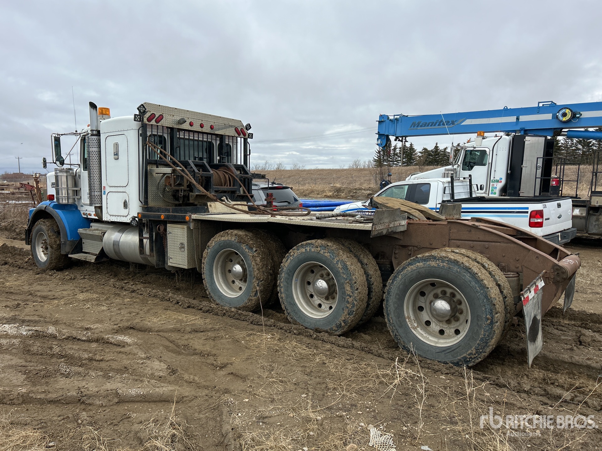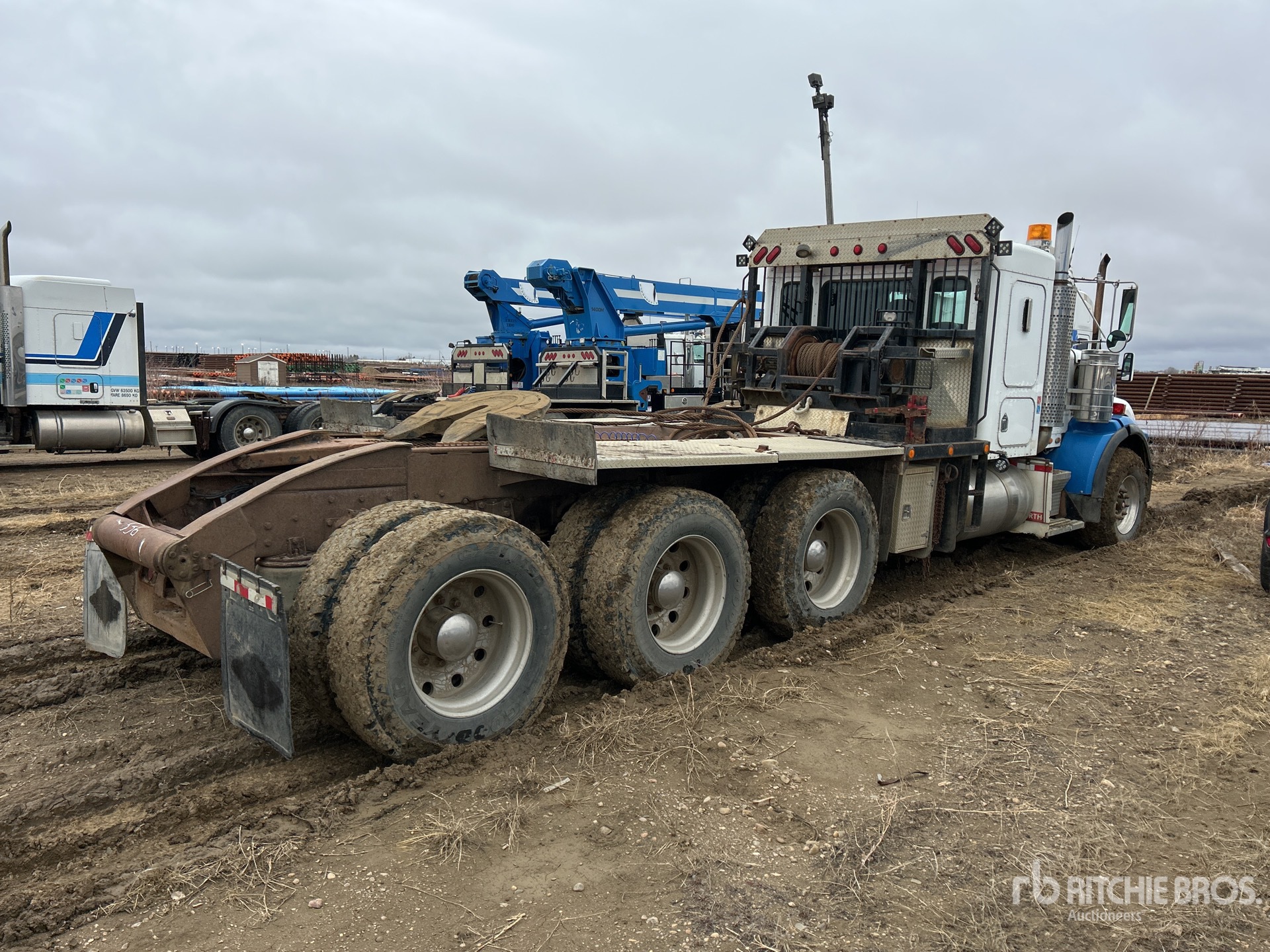Cat C15 6 Cylinder Diesel 475 hp Engine, Positive Air Shutoff, 28779 Engine hrs, Engine Brake, Eaton Fuller RTLO-18918B 18-Speed Manual Transmission, Eaton Fuller AT-1202 Auxiliary Transmission, Triple Differential Locks, 19664 lb Front Axle, 58000 lb Rears, Dana TDS583P Drive Axles, 4.33:1 Axle Ratio, 77664 lb GVWR, Air Ride Cab, 42 in Flat Top Sleeper Cab, Aluminum Wheels, 385/65R22.5 Front Tires, 11R24.5 Rear Tires, Dual Steering Boxes, Neway Air Ride Suspension, 260 in Wheelbase, PTO, Tail Roll, Lowboy Ramps