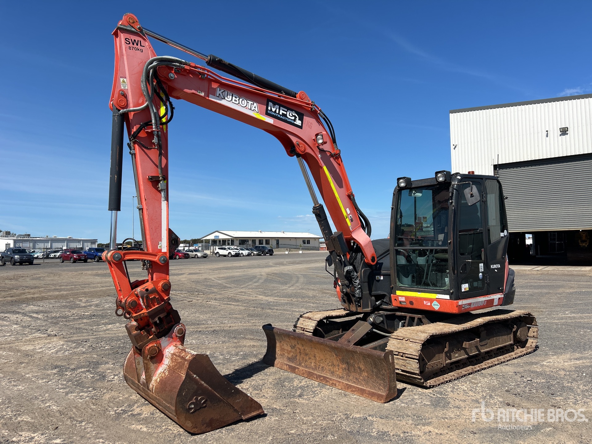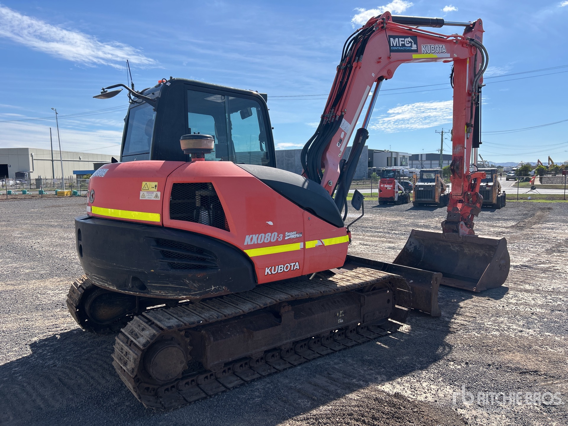 Air Conditioner, Control Pattern Changer, E-Stops, Swing Boom, 2100 mm Stick, Auxiliary Hydraulic Plumbing, Boom Check Valves, Backfill Blade, 450 mm Triple Grouser Track Shoes w/Rubber Pads, Tilting Hydraulic Quick Coupler, 1450 mm Cleanup Bucket, Thumb Bracket, equipment-from-mfc-contractors