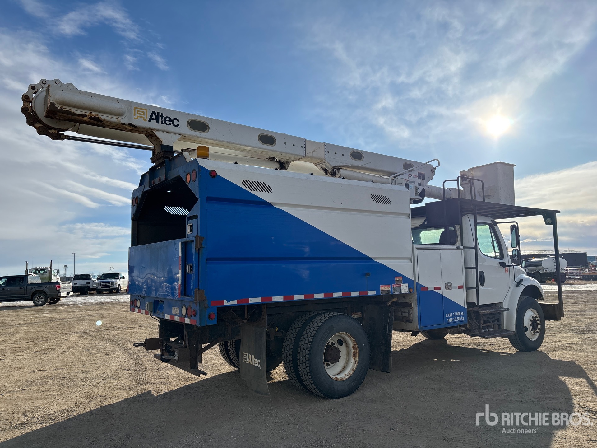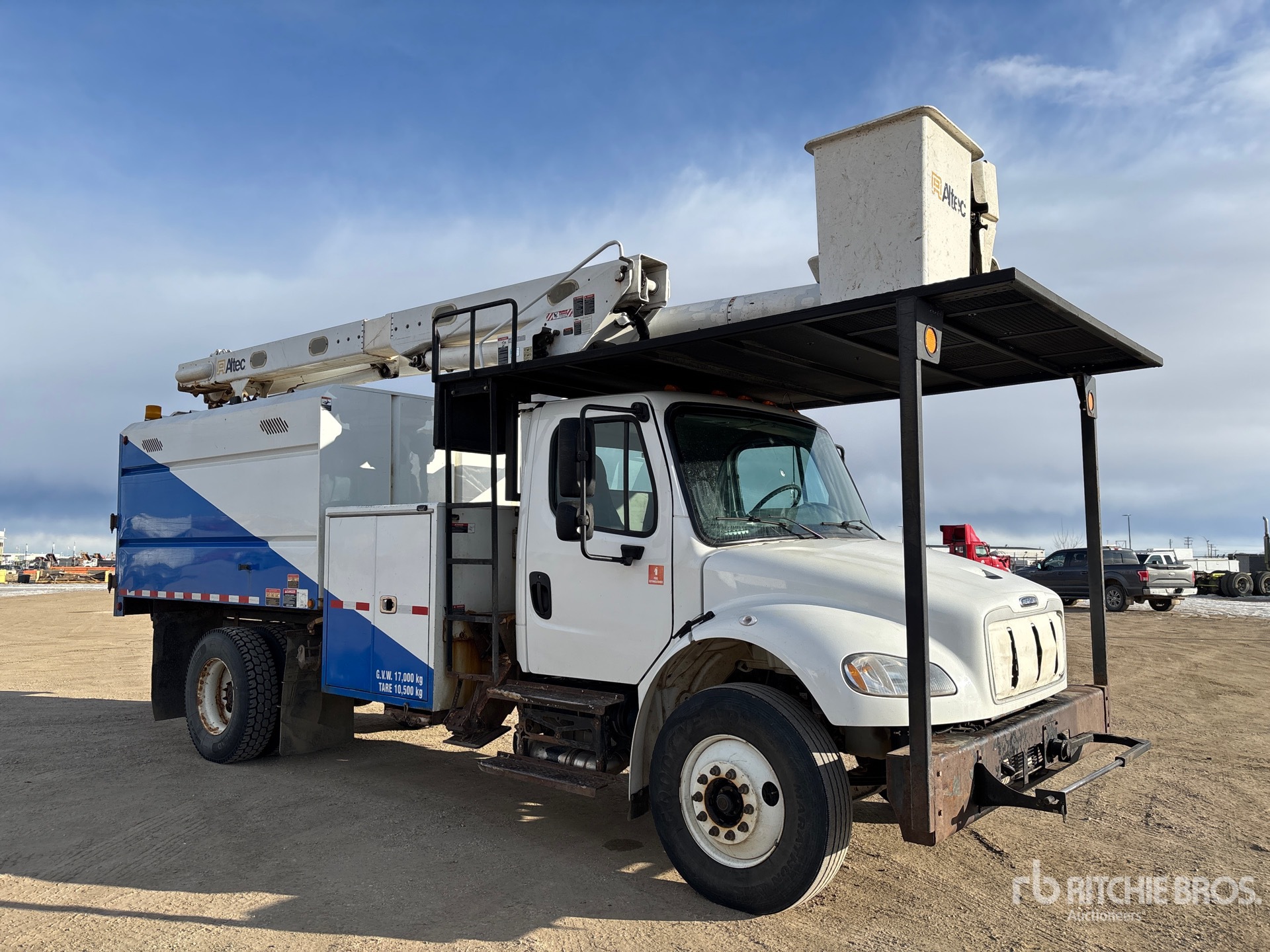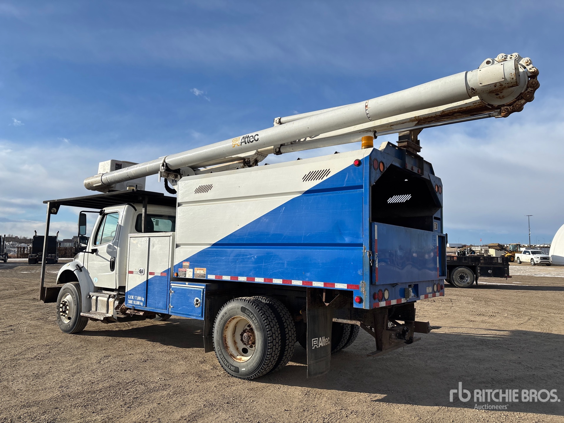 Cummins ISB 6 Cylinder 6.7 L Diesel 240 hp Engine, 2014 US EPA Label, CARB Compliant, Requires Diesel Exhaust Fluid, 13684 Engine hrs, Allison 3500 5-Speed Automatic Transmission, 13220 lb Front Axle, 21000 lb Rears, Meritor MS-21-14X Drive Axles, 5.57:1 Axle Ratio, 34220 lb GVWR, 11R22.5, Spring Suspension, 190 in Wheelbase, PTO, 400 lb Capacity, Rear Mounted, One-Person Articulated Boom, Utility Body, A-Outriggers, 11 ft x 96 in Bed, Pintle Hitch