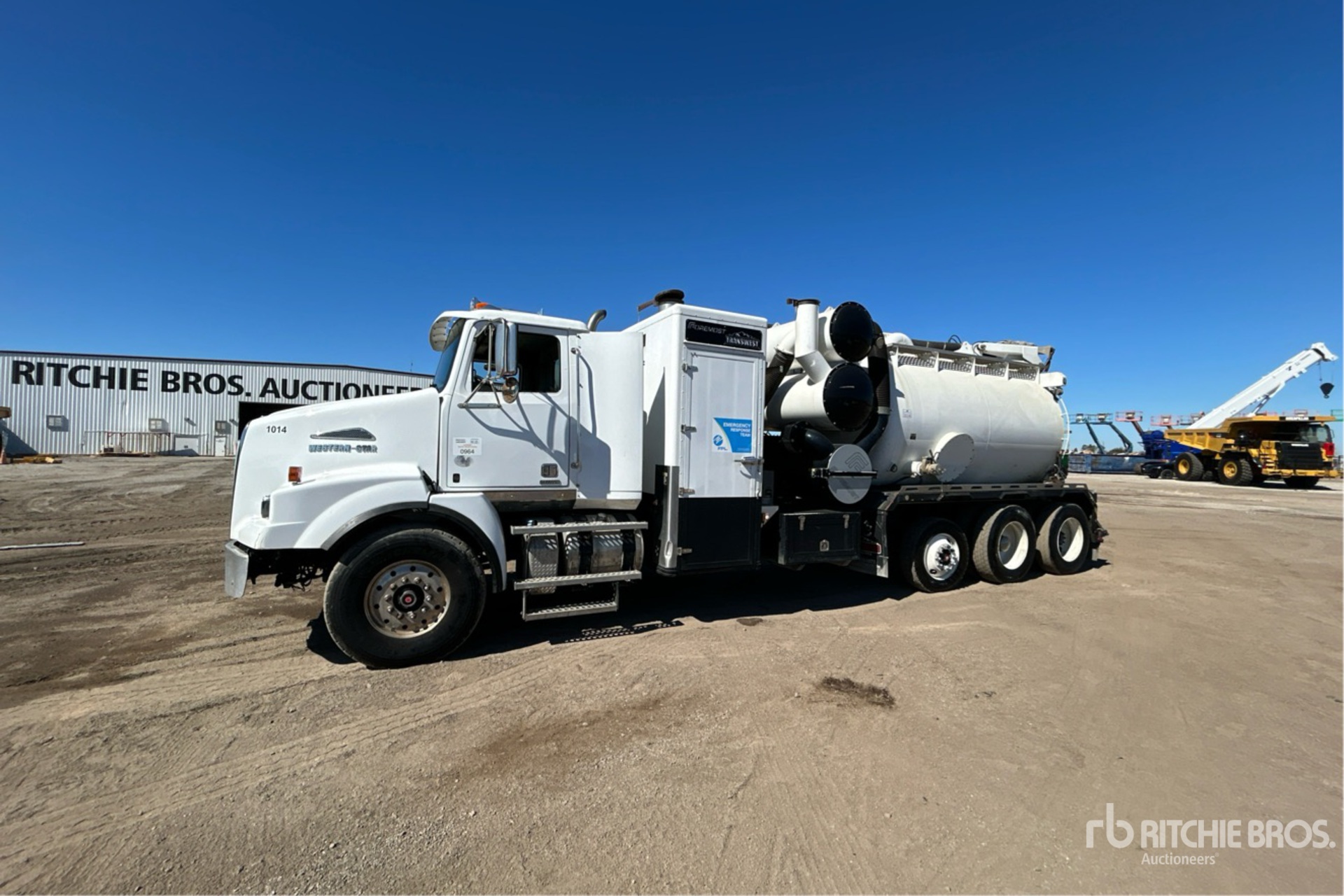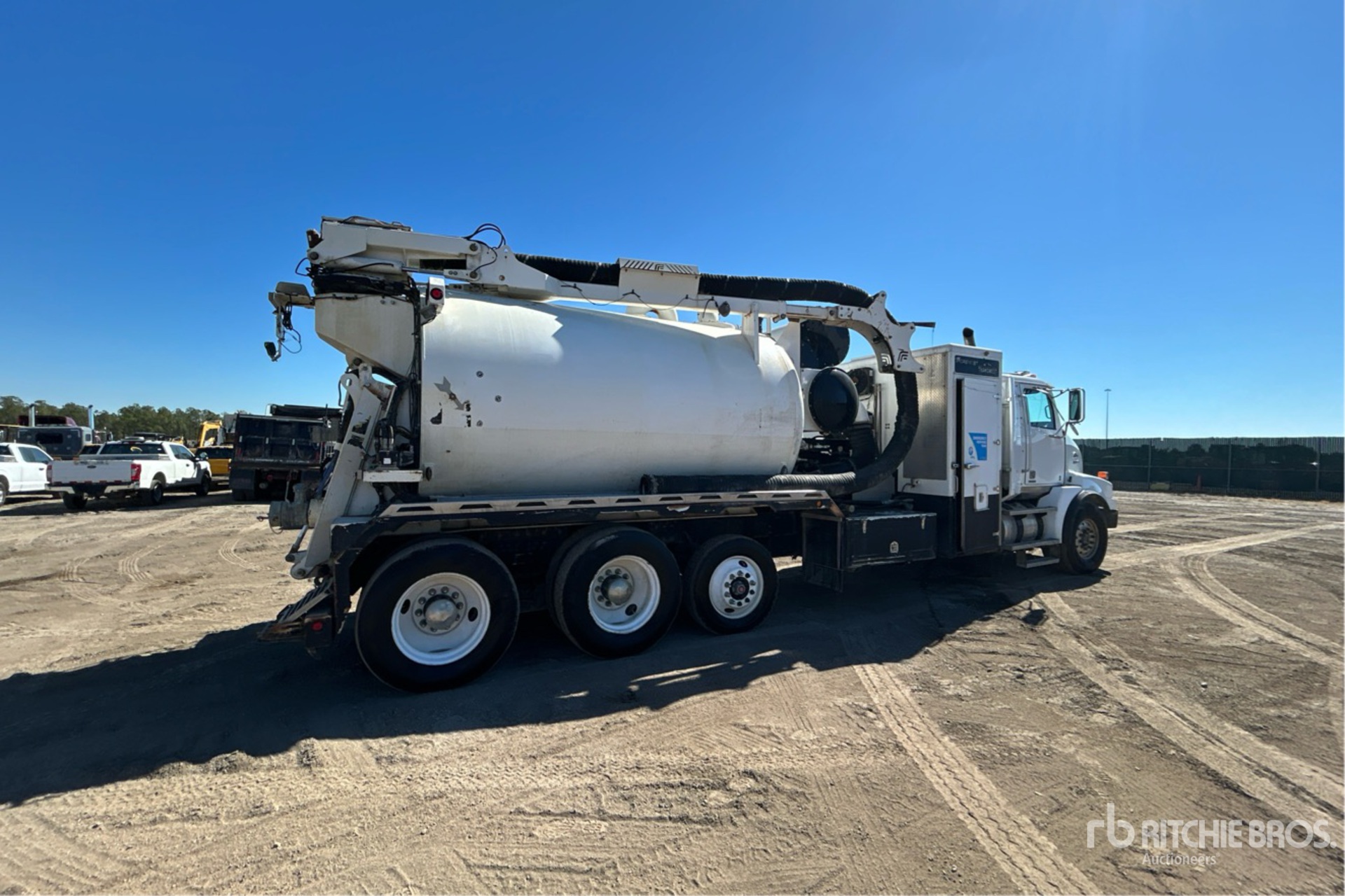 Detroit DD13 12.8 L Diesel 450 hp Engine, 2015 US EPA Label, Requires Diesel Exhaust Fluid, 8462 Engine hrs, Engine Brake, Eaton Fuller FRO-16210C 10-Speed Manual Transmission, 20000 lb Front Axle, 59200 lb Rears, 3.91:1 Axle Ratio, Air Ride Cab, Aluminum Front Wheels, 425/65R22.5 Front Tires, 11R24.5 Rear Tires, Dual Steering Boxes, Double Frame, Hendrickson Haulmaax Rubber over Walking Beam Suspension, 314 in Wheelbase, Steel 2120 gal Debris Tank, Hydraulic Lift Tailgate, Hydraulic Tailgate Locks, Boom, 8 in Suction Hose, Hydraulic Driven Pump, Robuschi RB-DV-125 Blower, Dynablast 700000 BTU Boiler w/ 67 hrs