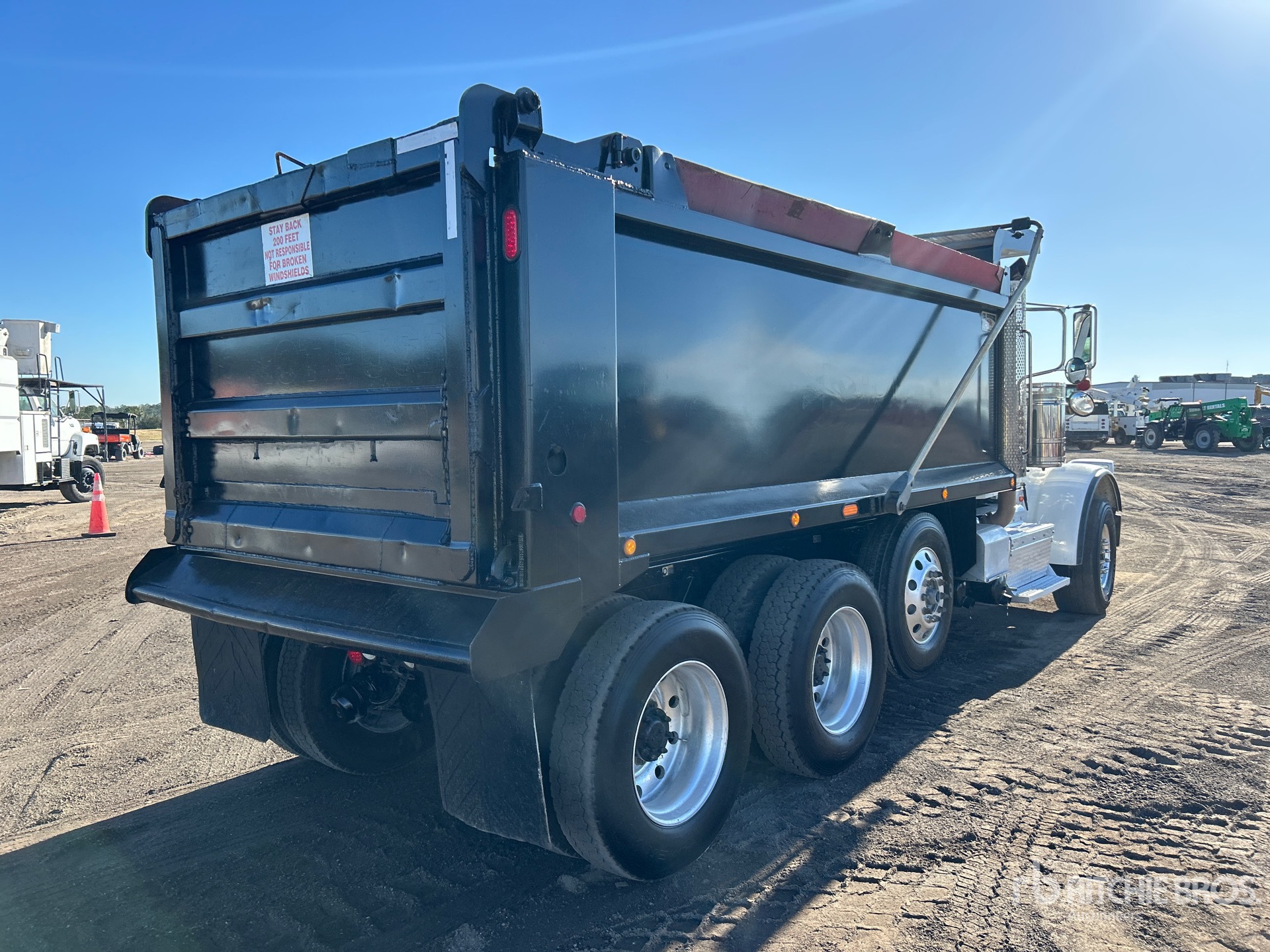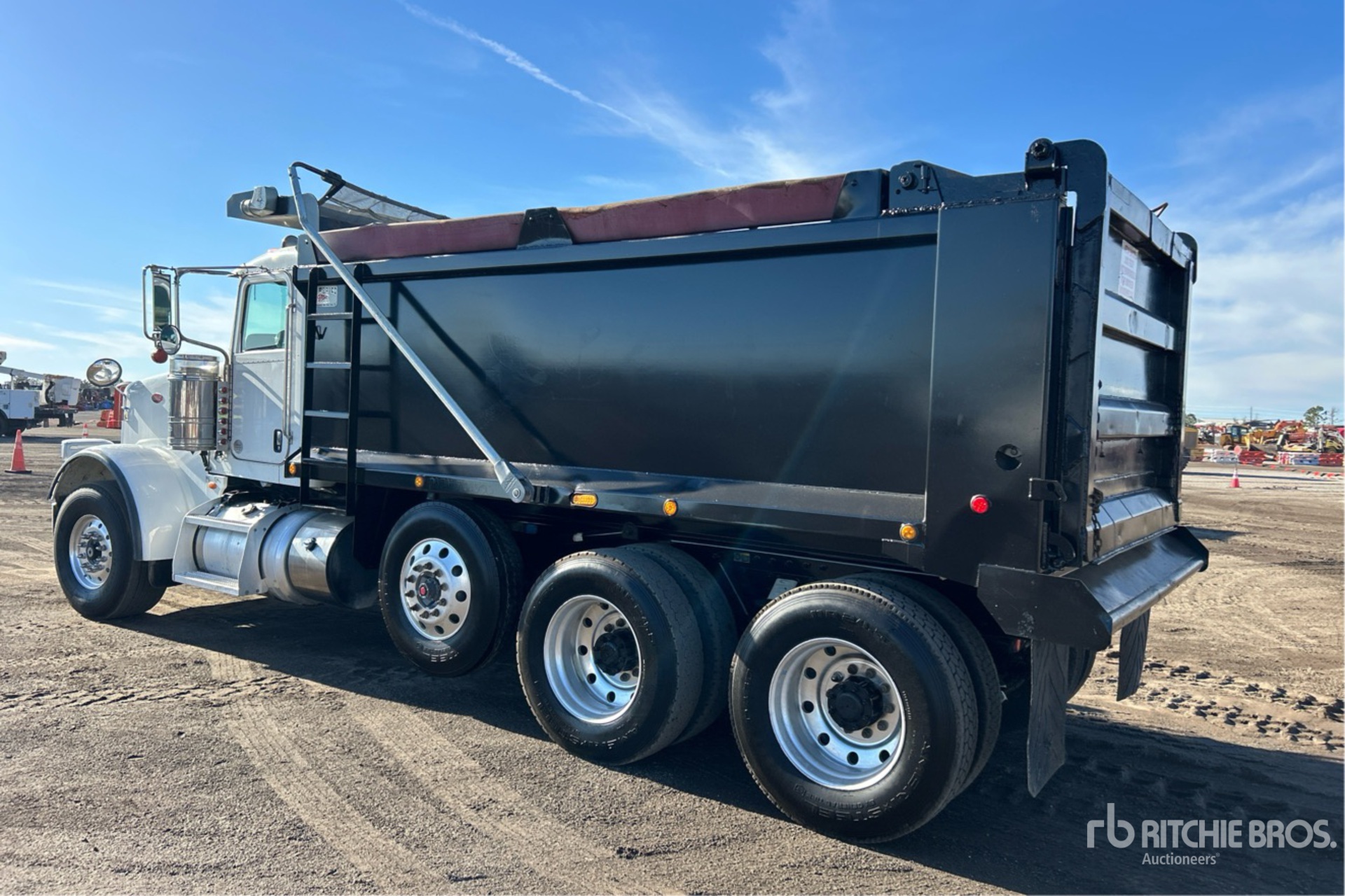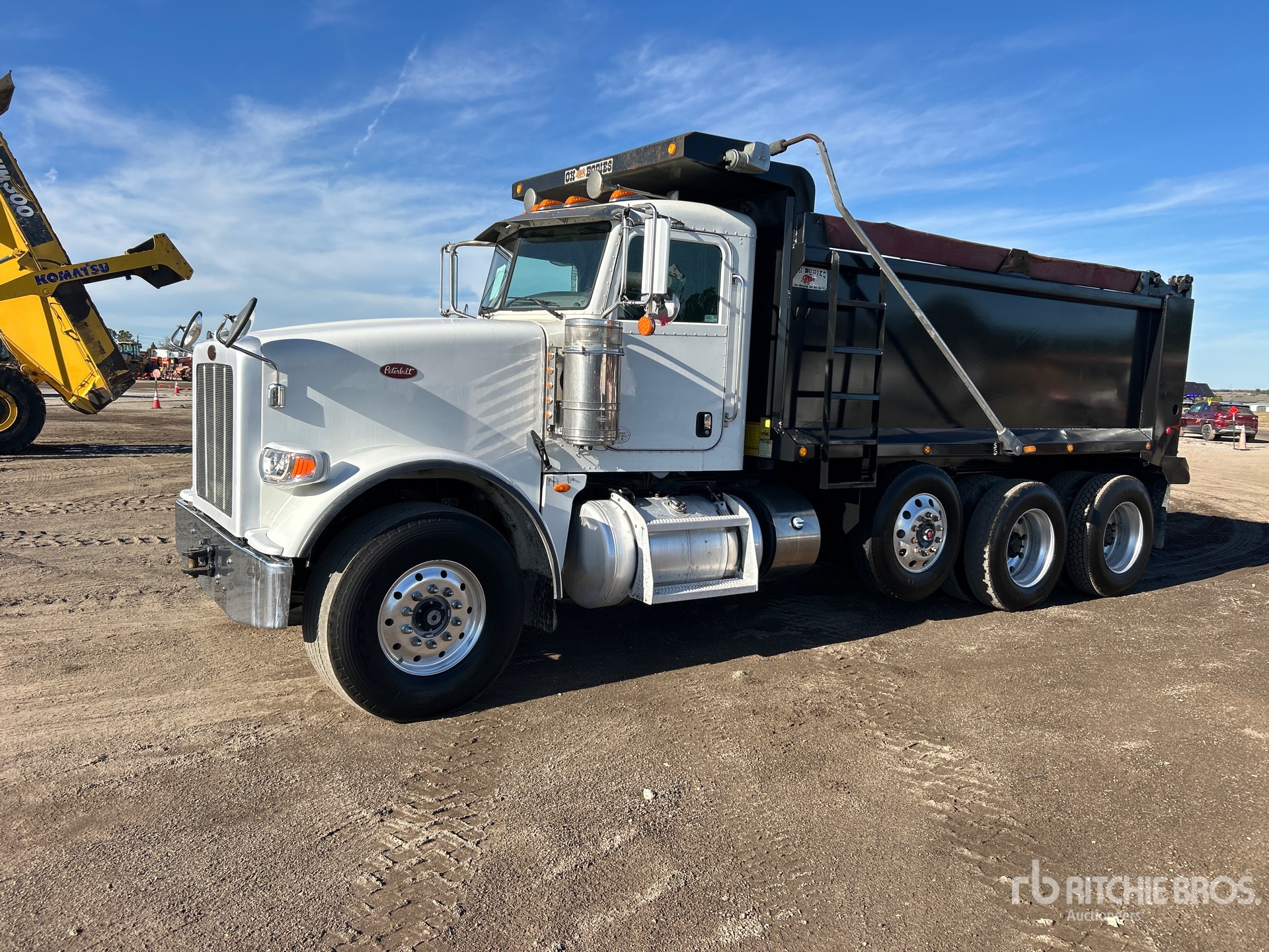Cummins ISX12 11.9 L 425 hp Engine, US EPA Label, Requires Diesel Exhaust Fluid, 24859 Engine hrs, Engine Brake, Allison 4500 Automatic Transmission, Differential Lock, 20000 lb Front Axle, 59220 lb Rears, 4.56:1 Axle Ratio, 79220 lb GVWR, Aluminum Wheels, 425/65R22.5 Front Tires, 11R24.5 Rear Tires, Steerable Air Lift Tag Axle, Dual Steering Boxes, Double Frame, Chalmers Suspension, 230 in Wheelbase, OX Bodies 20 ft Long x 5 ft 2 in High Steel Body, 20 cyd, Capacity, Round Bottom, Electric Roll Tarp, High-Lift Tailgate