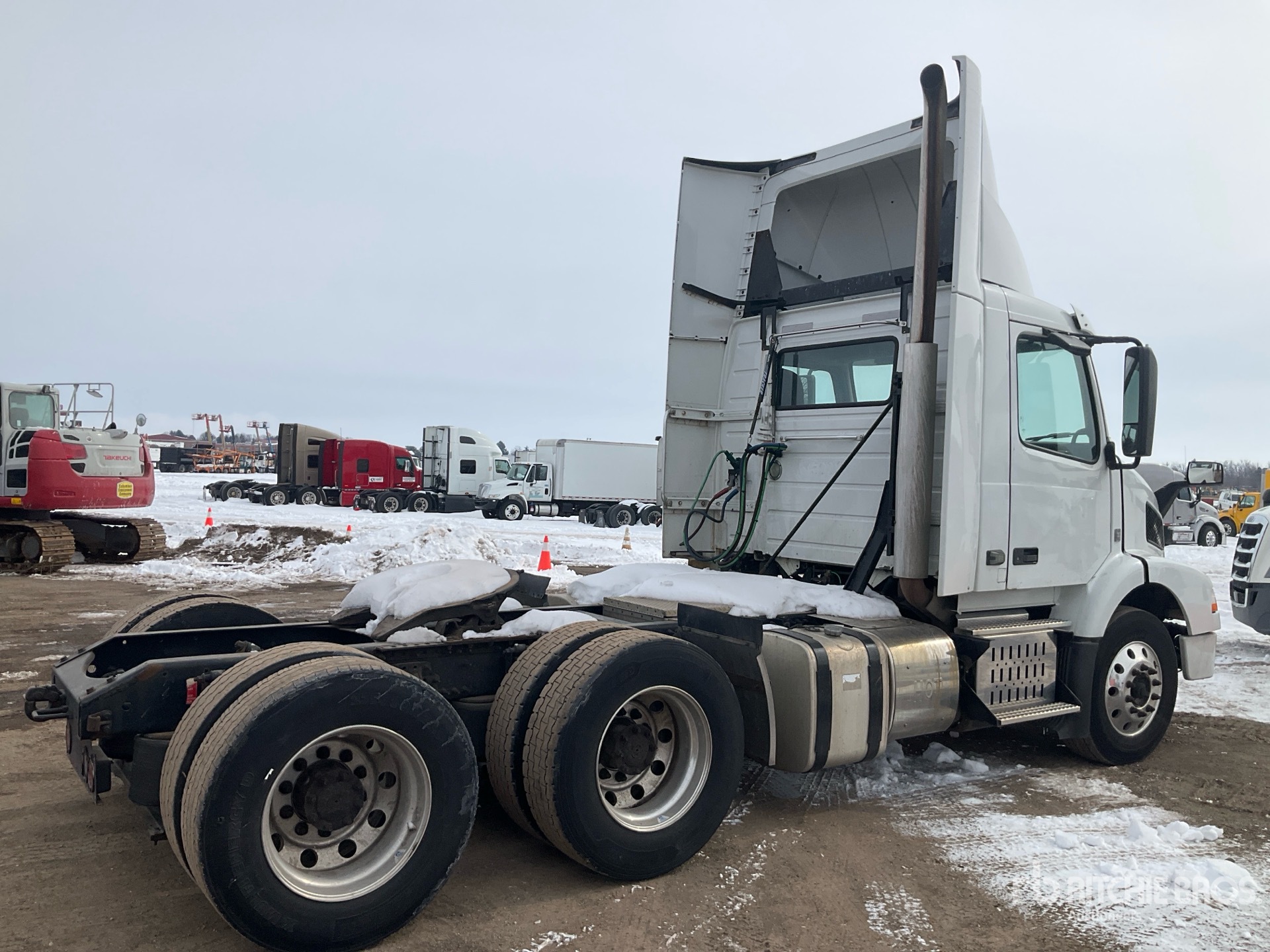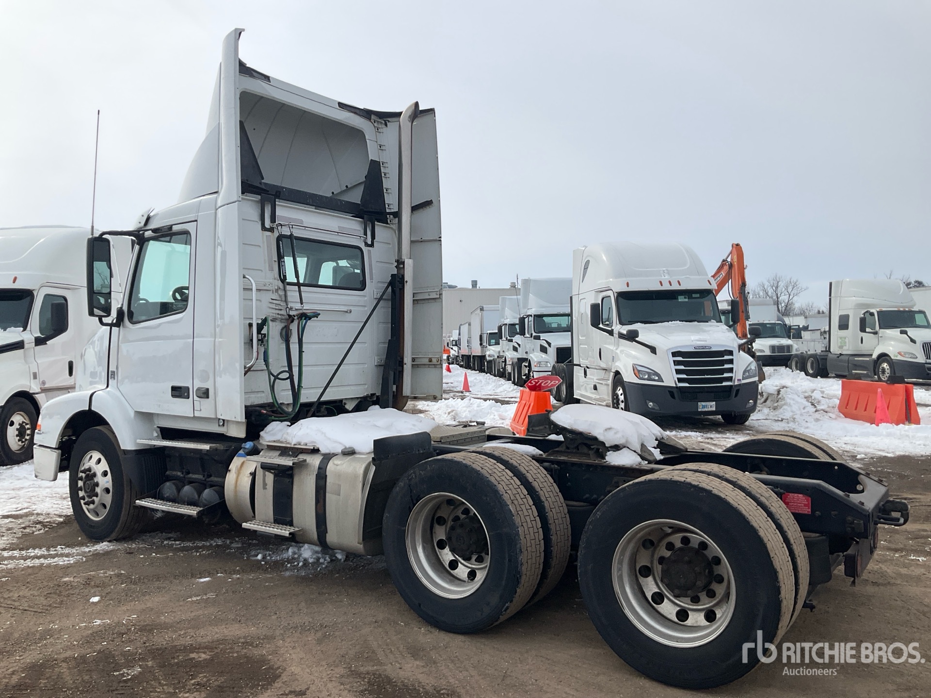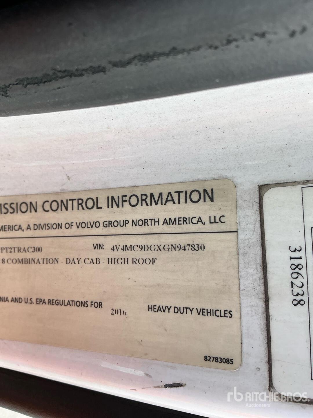 Volvo D11 385 hp Engine, 2015 US EPA Label, 14737 Engine hrs, Eaton Fuller FR-14210B 10-Speed Manual Transmission, 13200 lb Front Axle, 40000 lb Rears, 53200 lb GVWR, 173 in Wheelbase, Air Suspension, Aluminum Wheels, 275/80R22.5, Dual Fuel Tanks