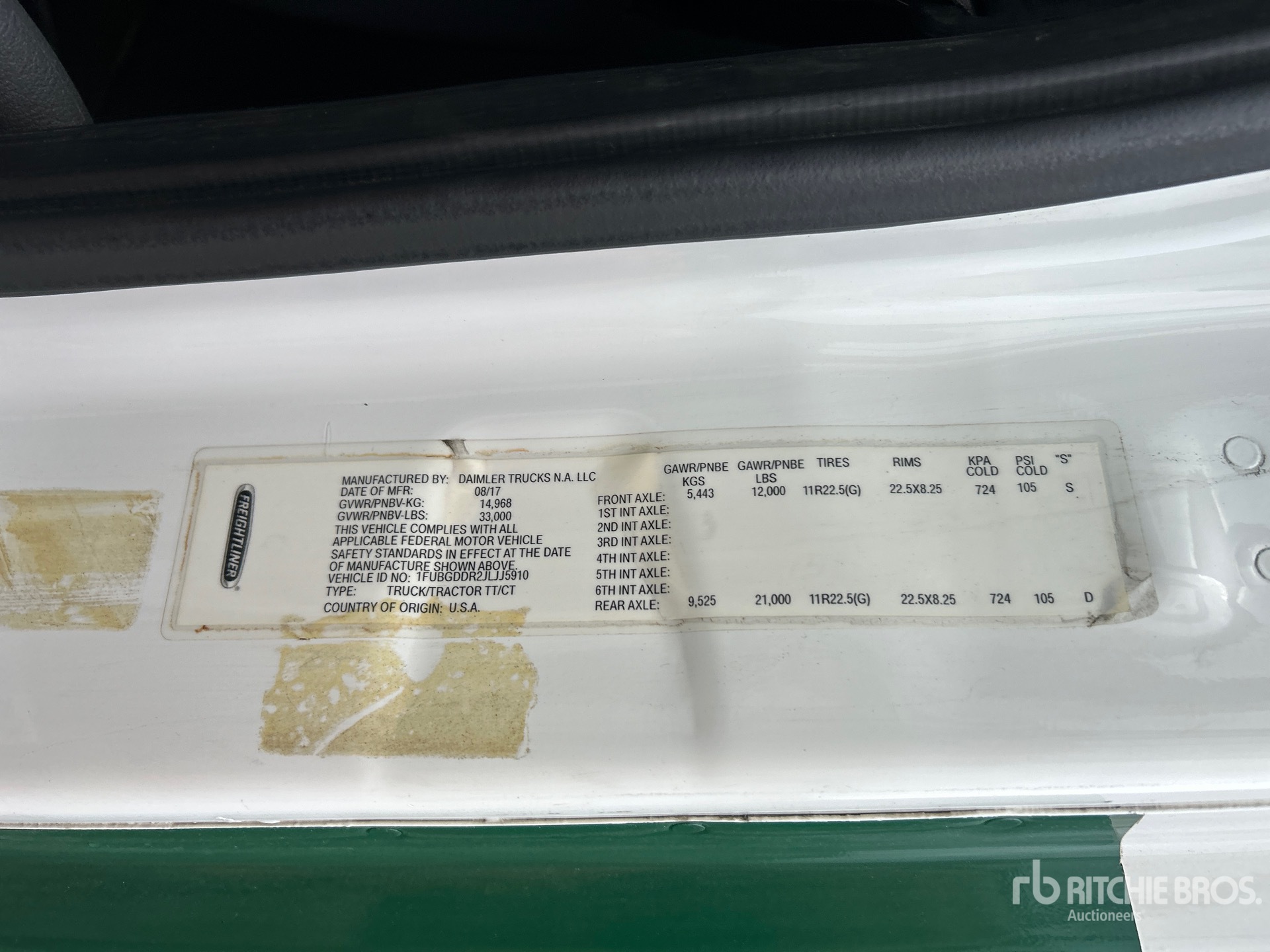 Detroit DD15 Engine, 2017 US EPA Label, Eaton Fuller FR-14210B 10-Speed Manual Transmission, 12000 lb Front Axle, 21000 lb Rears, 33000 lb GVWR, 158 in Wheelbase, Air Suspension, 11R22.5, Dual Fuel Tanks