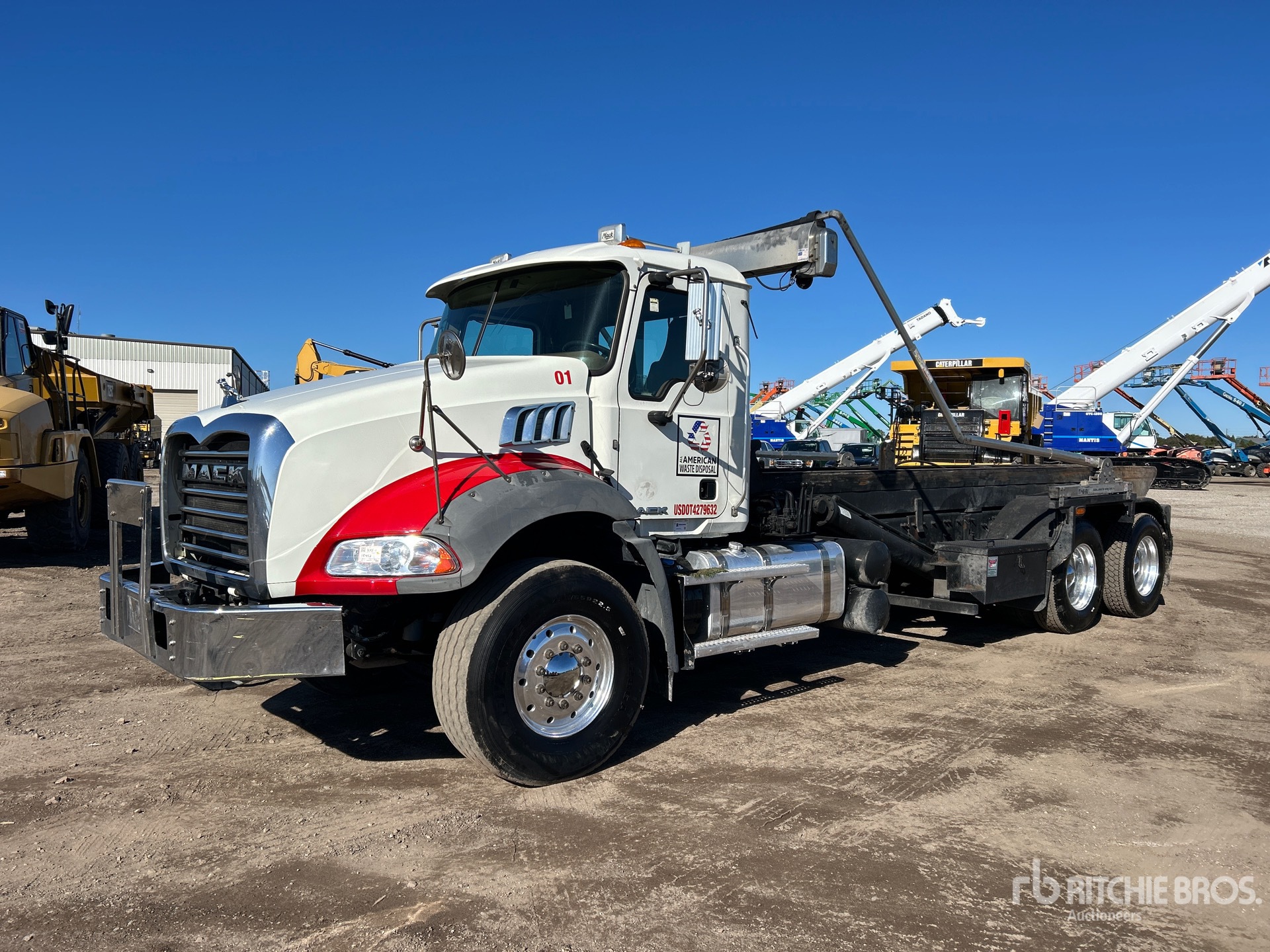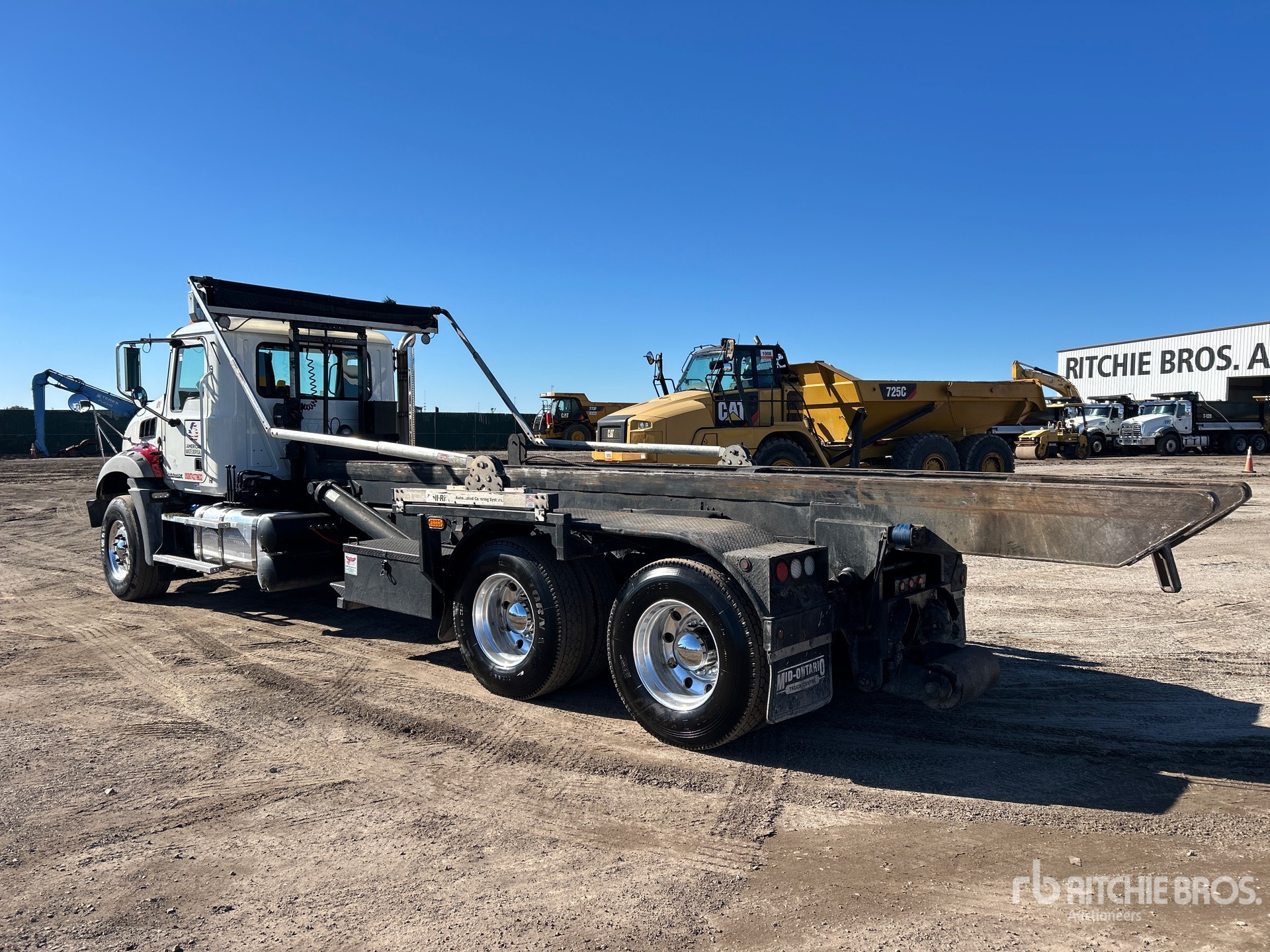 Located in Lane 52 Spot 11, Mack MP7 6 Cylinder 10.8 L Diesel 395 hp Engine, 2017 US EPA Label, Requires Diesel Exhaust Fluid, 21982 Engine hrs, Engine Brake, Allison Automatic Transmission, Differential Lock, 9100 kg Front Axle, 20800 kg Rears, 29900 kg GVWR, Air Ride Cab, Aluminum Wheels, 425/65R22.5 Front Tires, 11R22.5 Rear Tires, Dual Steering Boxes, Double Frame, Hendrickson Haulmaax Rubber over Walking Beam Suspension, 256 in Wheelbase, PTO, 2018 John & Sons 60MLB Roll-Off Body, 24 ft Hoist, Winch, Pintle Hitch
