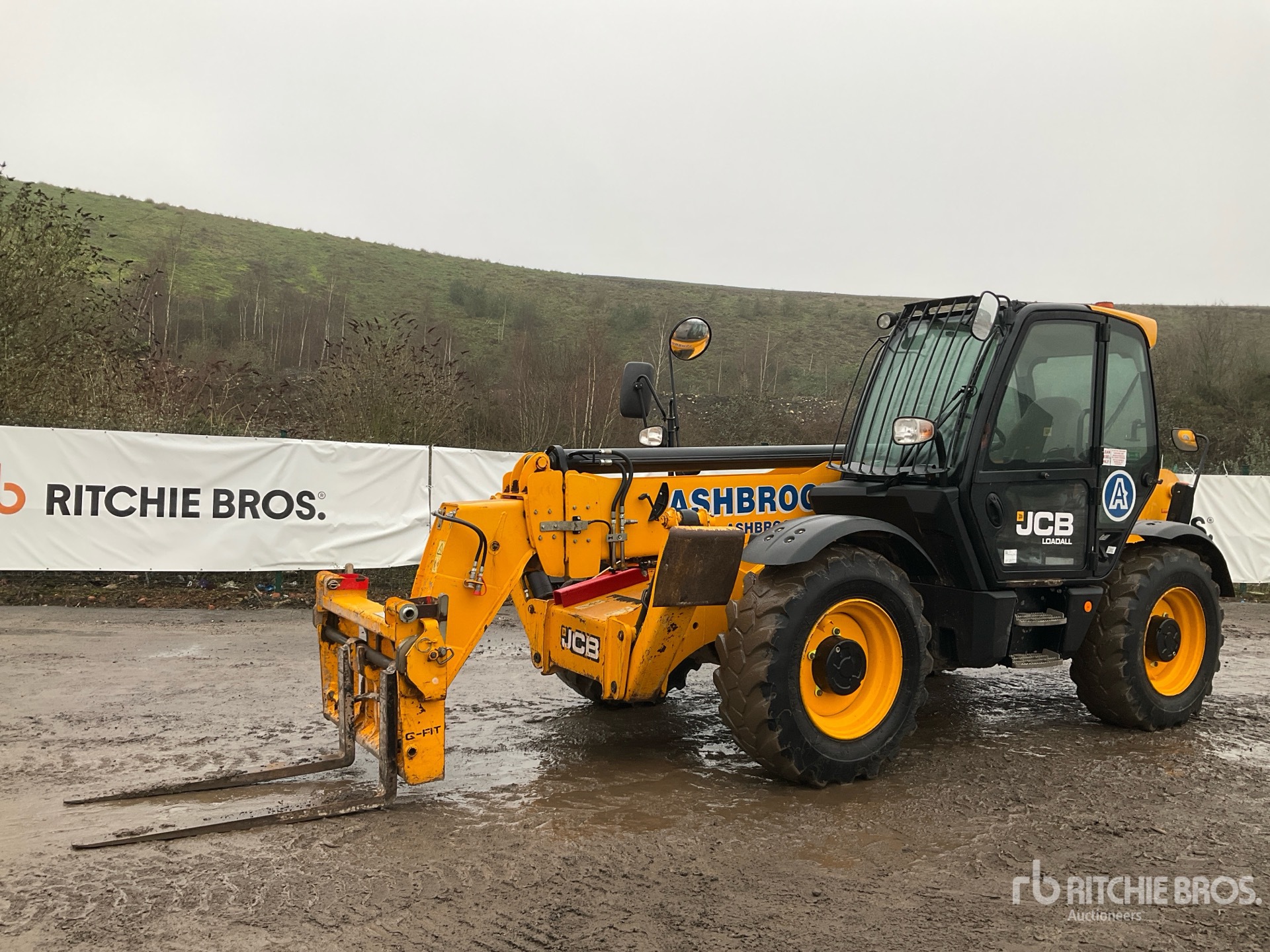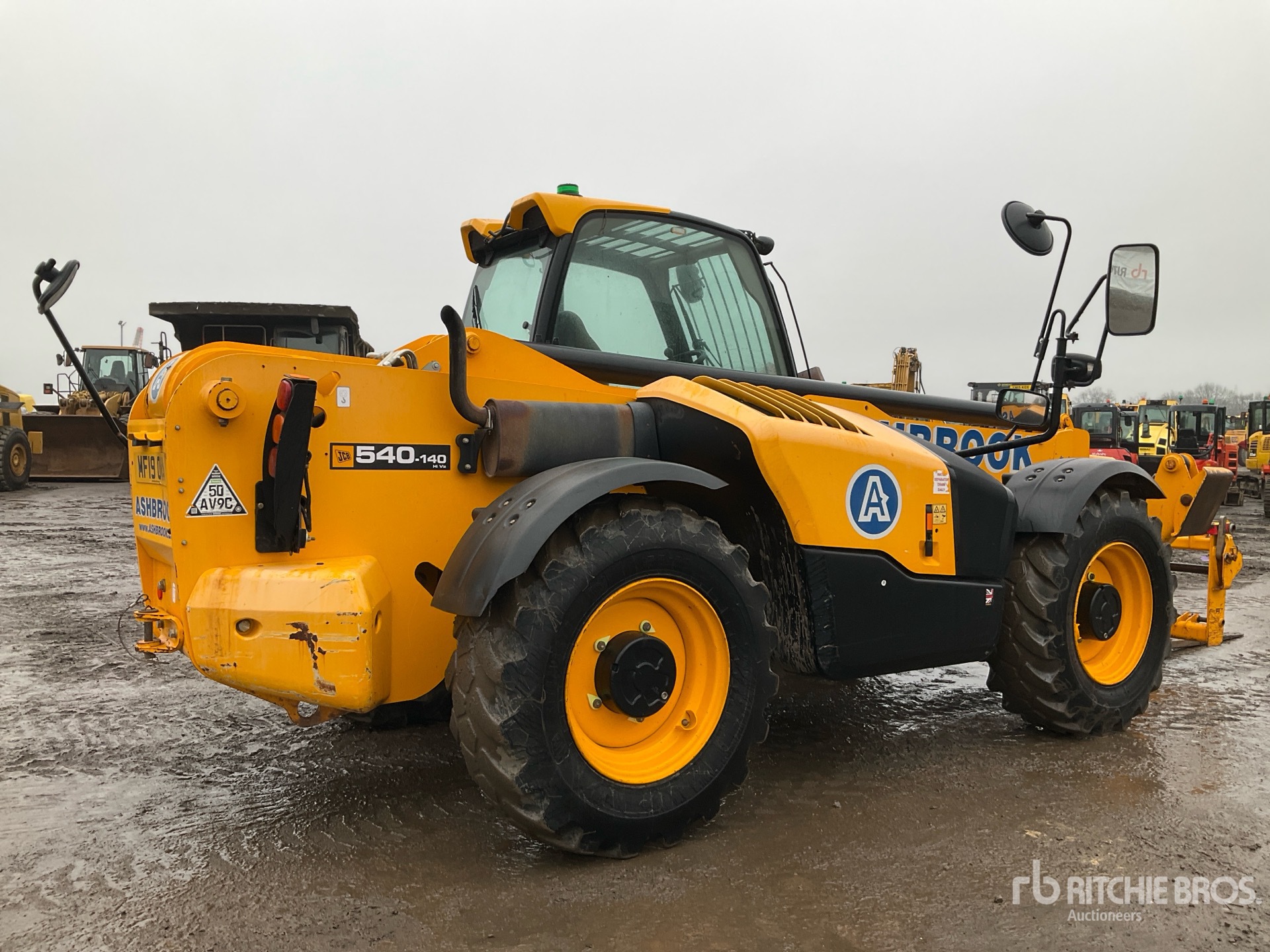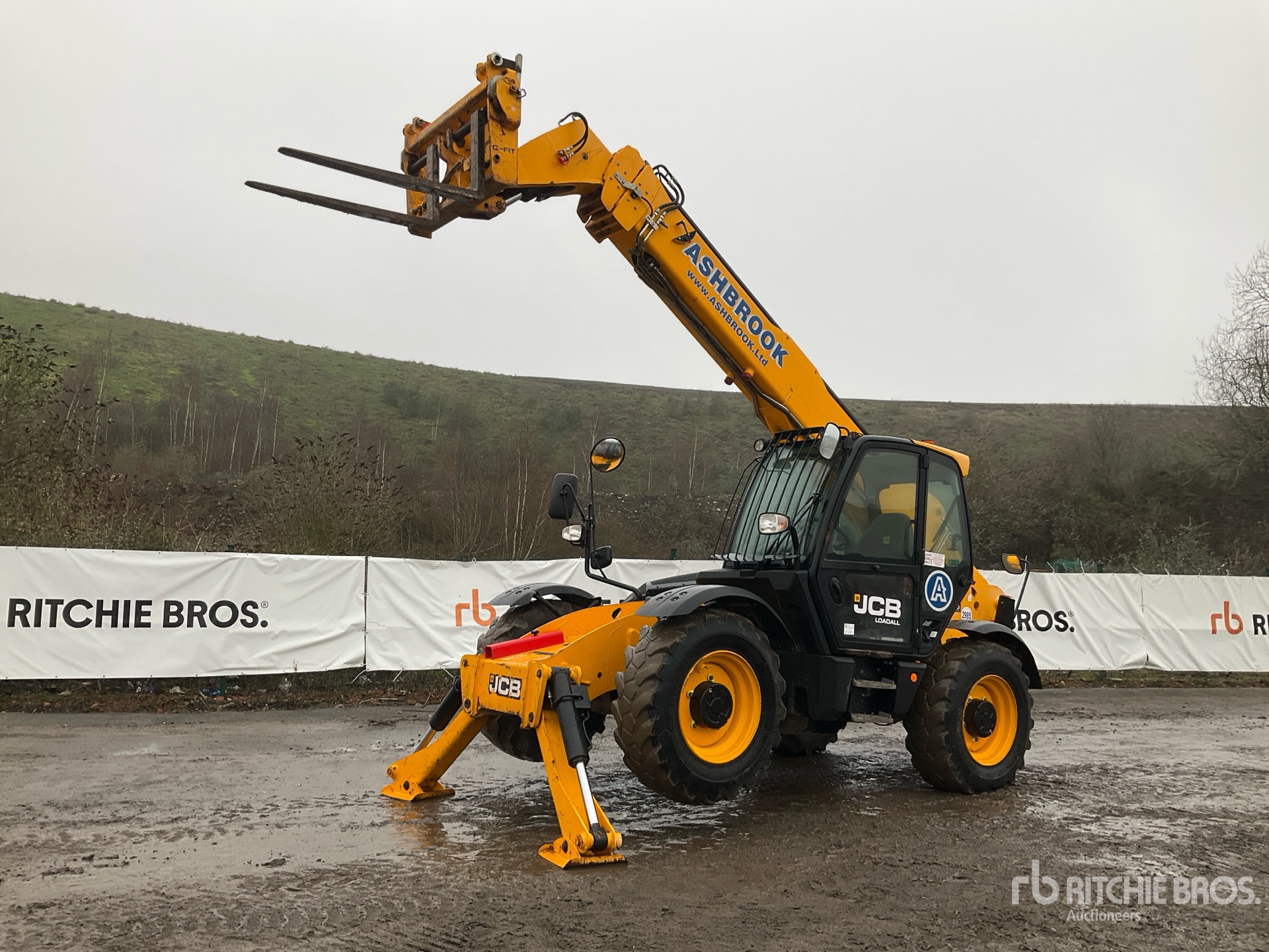 Enclosed Cab, Load Moment Indicator, 13.78 m Max Lift Height, 4000 kg Max Lift Capacity, 1190 mm Forks, Manual Coupler, Outriggers, Auxiliary Hydraulic Plumbing, 15.5-25 Tires