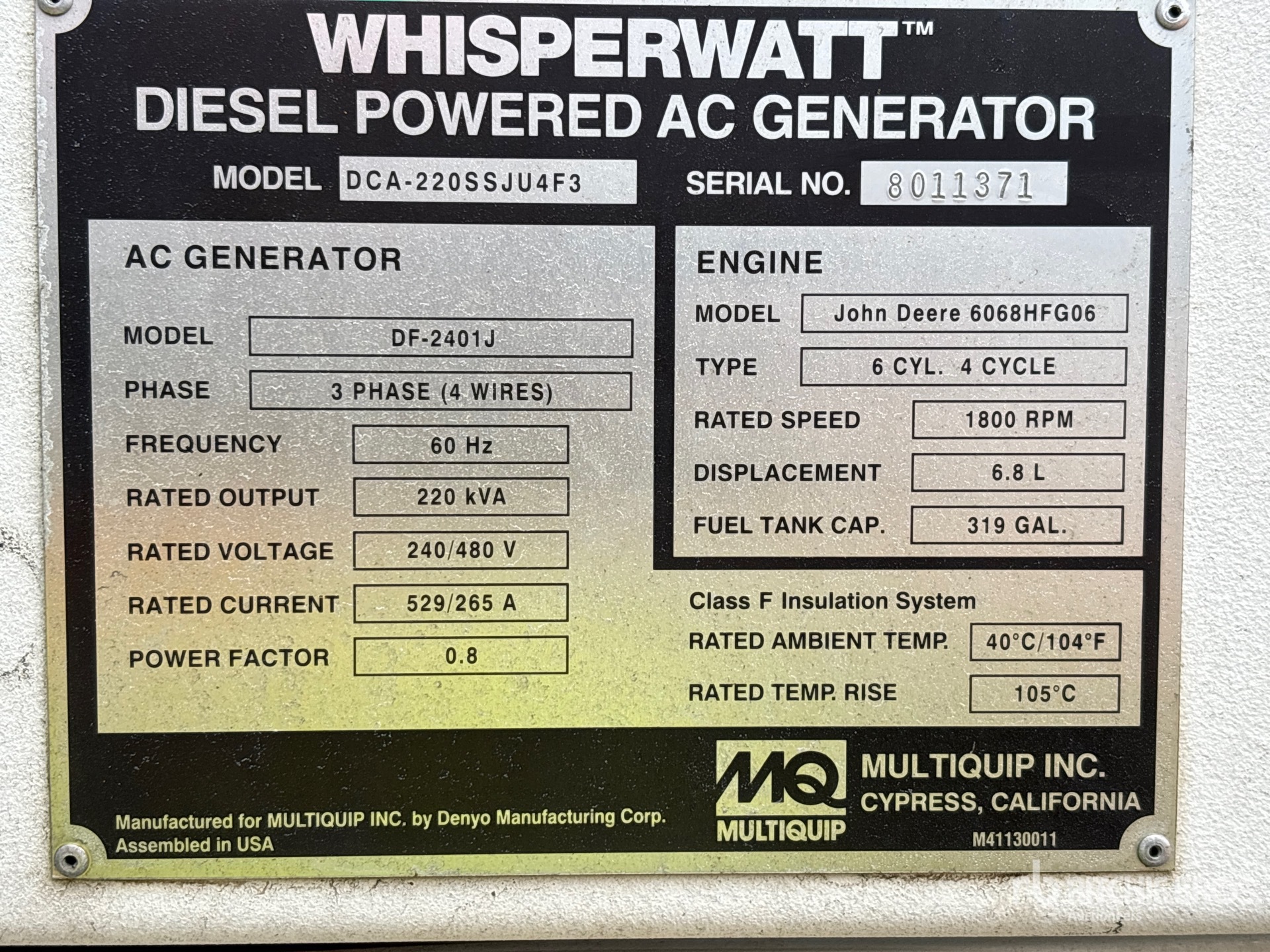 2019 US EPA Label, CARB Compliant, John Deere 6068 6 Cylinder 6.8 L Diesel Engine, Requires Diesel Exhaust Fluid, 220 kVA/ Rated 3 Phase Output, 240 V / 480 V Rated Voltage, 240 V & 120 V Receptacles, Sound Attenuated, Bottom Mounted Fuel Tank