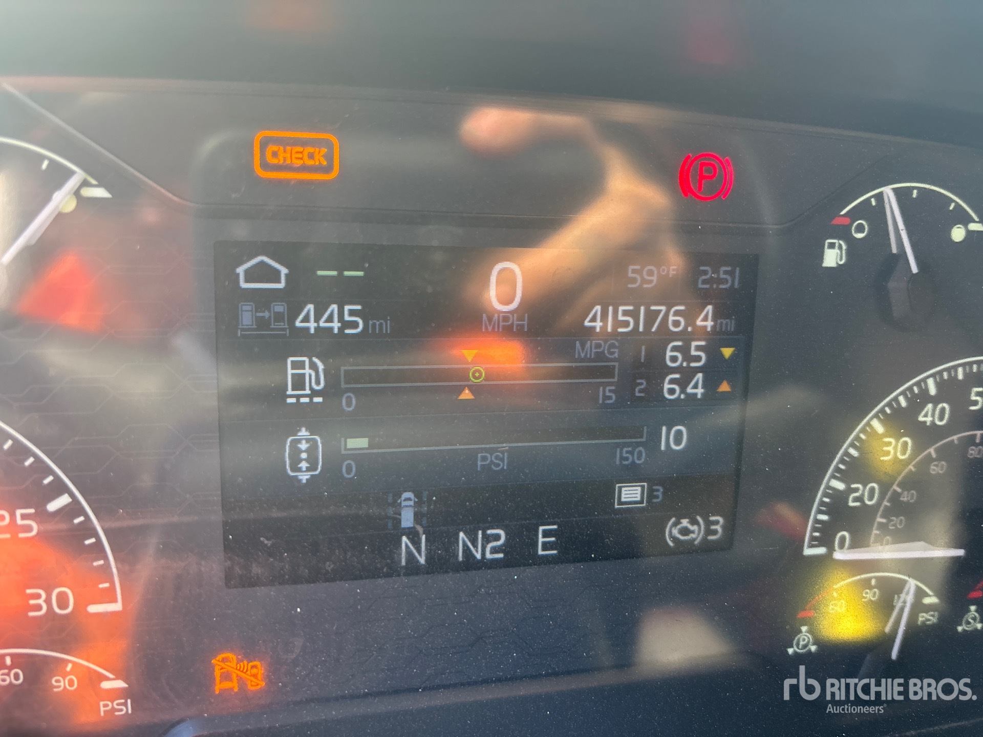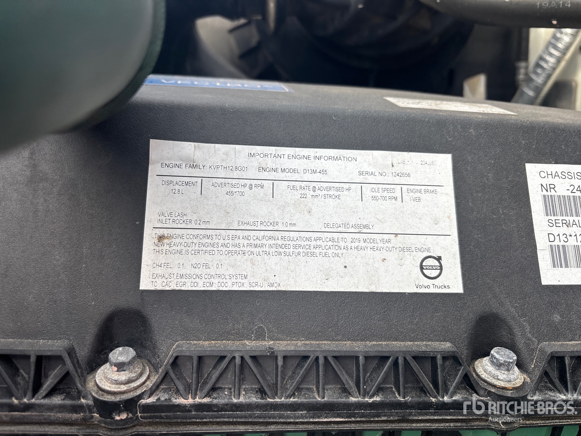 Volvo D13 455 hp Engine, 2019 US EPA Label, 10012 Engine hrs, Volvo AT2612F 12-Speed Automated Transmission, 12500 lb Front Axle, 38000 lb Rears, 50500 lb GVWR, Engine Brake, 70 in High Rise Sleeper Cab, Bunk Beds, 222 in Wheelbase, Air Suspension, Aluminum Wheels, 295/75R22.5, Air Sliding 5th Wheel, Dual Fuel Tanks