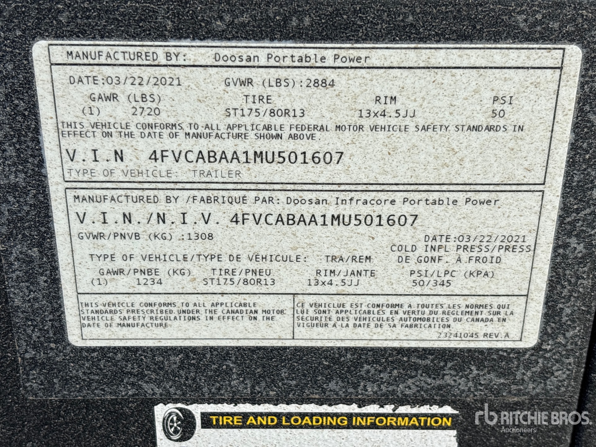 2019 US EPA Label, Doosan 4 Cylinder 37 kW Diesel Engine, Lunette Ring Carrier Trailer