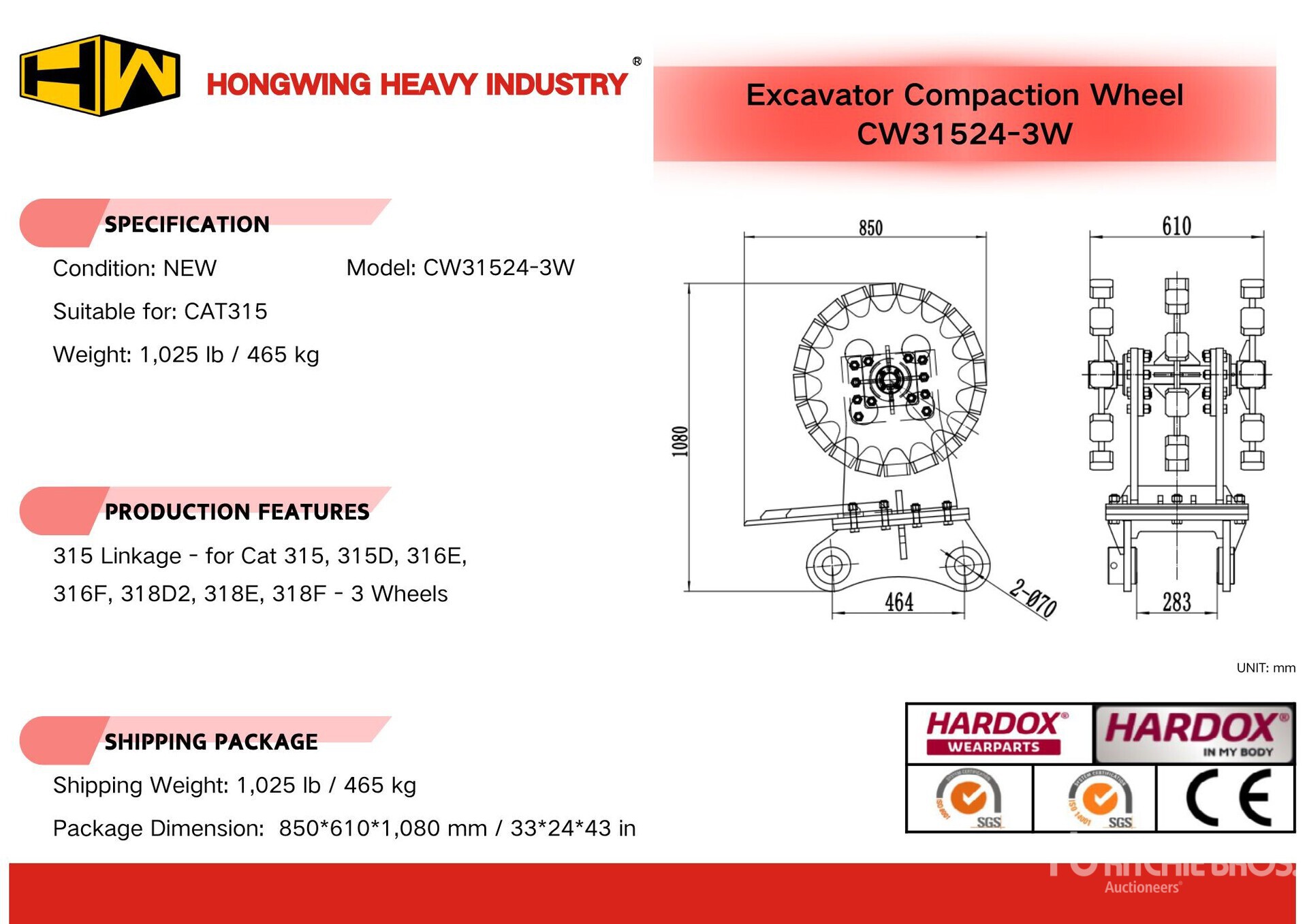 2026 HW CW31524-3W 24 in عجلة ضغط الحفارة - Fits Cat 315 (Unused)