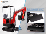 US EPA Label, 2 ft 7 in Stick, Auxiliary Hydraulic Plumbing, Backfill Blade, 7 in Rubber Tracks, 16 in Digging Bucket, Manual Thumb, Product images displayed are stock photos. Item is new/unused.