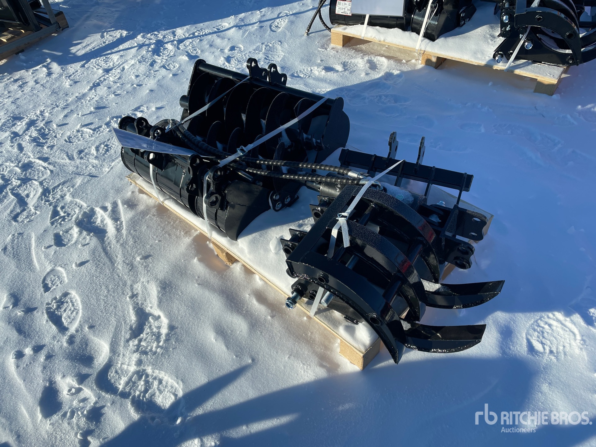 (1) 8 in Bucket, (1) 20 in Bucket, (1) 32 in Bucket, (1) Quick Coupler, (1) Ripper, (1) Grapple, (1) Rake, (1) 8 in Auger, (1) 12 in Auger,