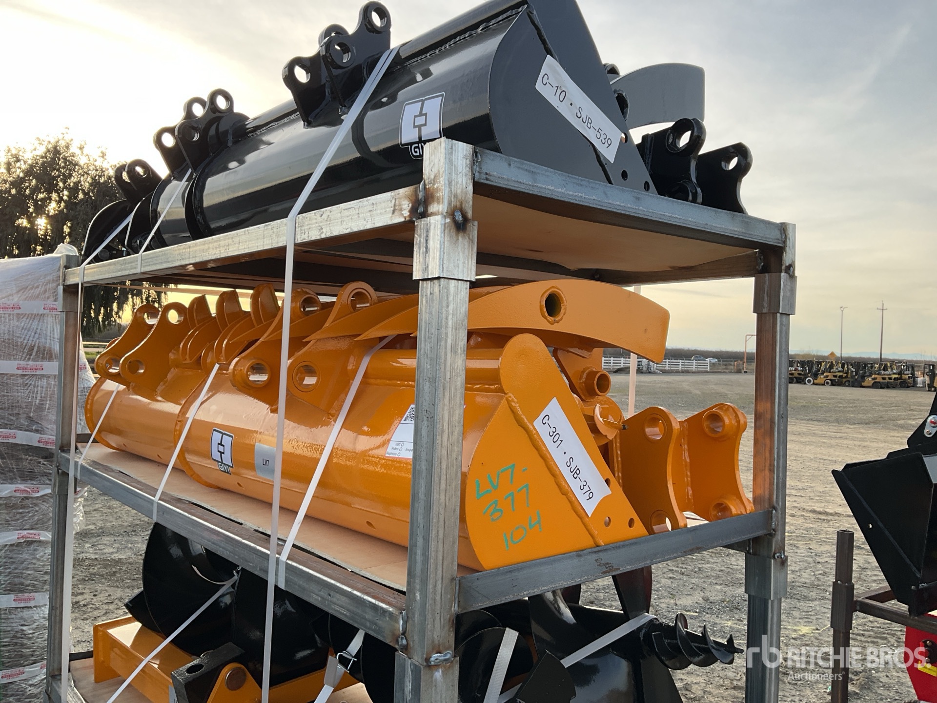 (1) Rake, (1) Ripper, (1) Grapple, (1) Auger w/ 12 in & 16 in Auger Bits, (1) 8 in Narrow Bucket, (1) 24 in Bucket, (1) 32 in Bucket