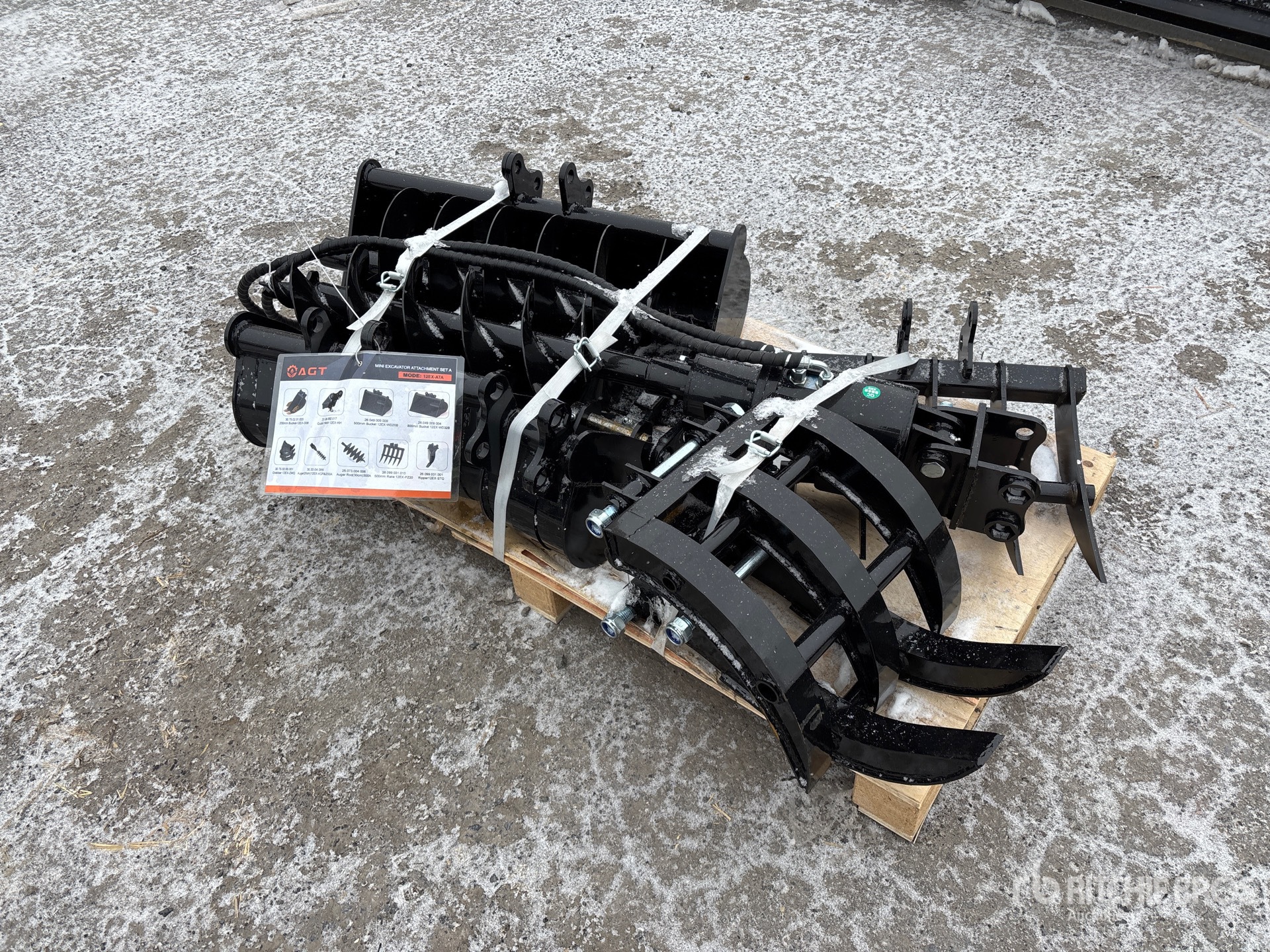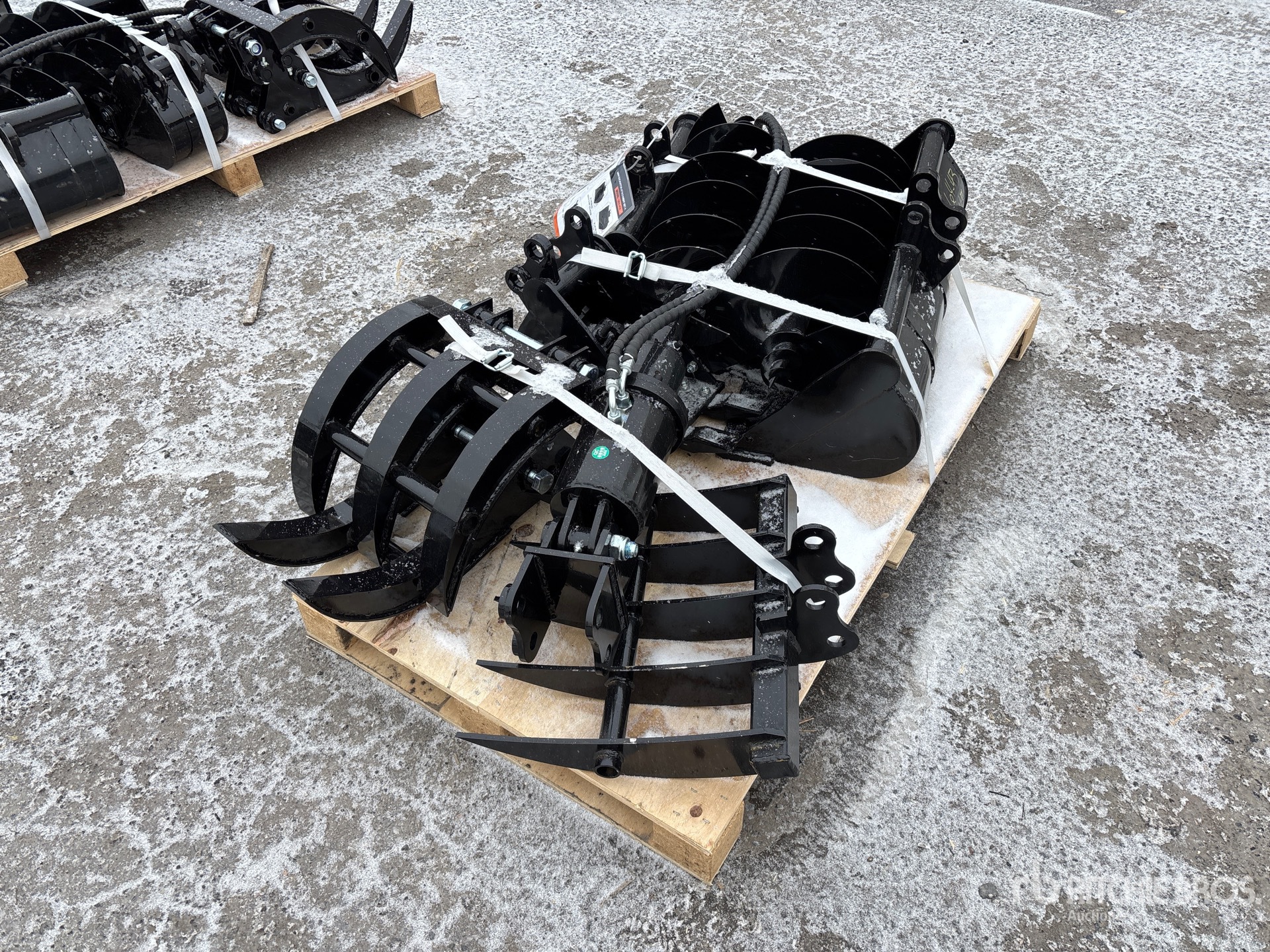 (1) 8 in Bucket, (1) 20 in Bucket, (1) 32 in Bucket, (1) Quick Coupler, (1) Ripper, (1) Grapple, (1) Rake, (1) 8 in Auger, (1) 12 in Auger,